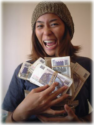 ジンバブエはインフレのまっただなか。貨幣価値がどんどん落ちているから、100ドル両替したら、ご覧の通り札束がドーンとやってくる。この国では闇両替がポピュラー。公定レートとの差が激しいから、外貨を持っているとお得 |