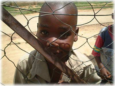 ![]() 金網のむこうから、じっとこちらを見つめる少年A。黒人の子供って、みんなめちゃめちゃカワイイ。このときは必殺「指の体操」で彼の視線を釘づけに |