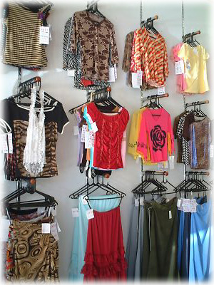 ハラレのお洋服屋さんの店内はこんな感じ。アフリカのギャル・ファッションはタイトでセクシーで派手なものが多い。しかもカットソーなんかは黒人サイズで裾が短いのだ |