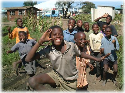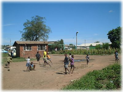 ![]() タウンシップの空き地でサッカーをする子供たち。みんなベコベコのボールを追って駆けずりまわっている。この国でもサッカーはポピュラーなスポーツだ |