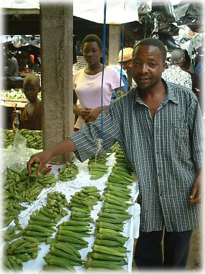市場の中でおじさんがオクラを売っていた。「え、オクラ?」って思うけど、ハイ、そのまんま日本と同じオクラなのです。しかも呼び名も「オクラ」。どうやらオクラはアフリカ原産のものらしい。もちろん庶民のための野菜で、地元の人もよく食べている |