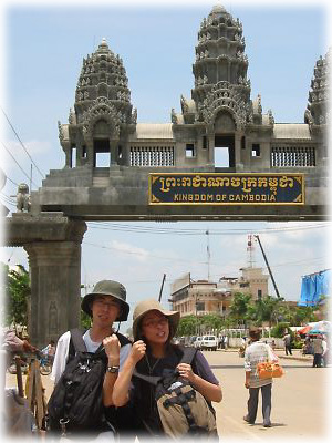 いよいよ次なる国、カンボジアに入国!余裕そうな表情ですが、前後にバックパックをしょってるのでけっこう大変 |