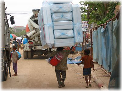 ![]() 国境だけあって、物や人の出入りはさかん。トラックやバスに混じって、頭で膨大な荷物を運ぶおばちゃんもいました。頭で物を運ぶ風景は各国で目にしますが、こんなデカイ荷物まで……(笑)。世界ハードコアヘッド運び屋大賞をさしあげます |