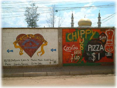 ![]() カンボジアにグラフィティ? と思いきや、近くのレストラン&ゲストハウスの広告でした。ポップな色使いが青い空にマッチ。思わずパチリ |