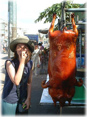 街で見かけた豚と豚の丸焼き(笑)。それにしてもこの色、照り、ツヤ……う〜んおいしそう |