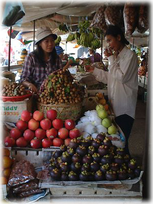 東南アジアだけあって、フルーツ屋のラインナップは大充実。手前にある濃紫の丸いヤツが私たちのお気に入りフルーツ、マンゴスチン |