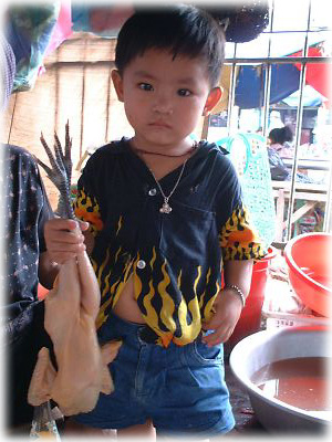 鶏肉屋のぼっちゃん。カンボジアの子供にしてはなかなかイカすファッションでしょ。「写真を撮りたい」と言ったら手に鶏をぶら下げてハイ、ポーズ |