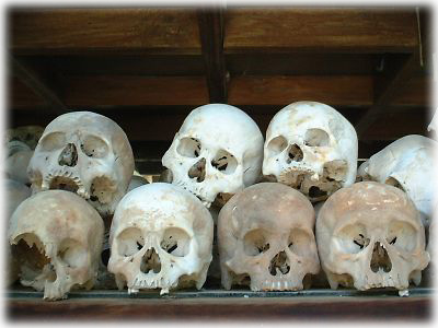 ![]() ポルポト派による大虐殺が行われたキリング・フィールドにて。もちろん本物の人骨です。彼らの尊い命のうえに、現在のこの国がある |