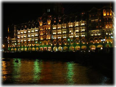 ![]() 夜のタージ・マハル・ホテル。この日はちょうど建設100周年記念のパーティとあって、ライトアップも豪華。世界中のVIPがこのホテルへと消えていくのを外からインド人と一緒に指をくわえて見ていました……。いつかは私たちも! と思わせるホテル |