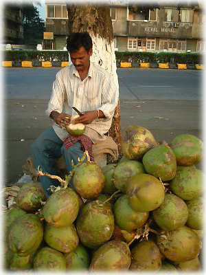 マリーン・ドライブ沿いではココナッツ売りのおじさんが仕事に精を出してました。ちなみに一個12ルピー。やっぱりボンベイは物価が高い! |