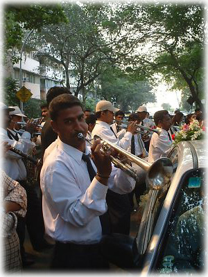 歩いていると、どこからともなくブラスバンドの音色が。どうやらお金持ちの人の結婚式のよう。愛嬌たっぷりなカメラ目線のトランペットおじさん。こういう「職業ブラスバンド」が普通に仕事をしているのもインドならでは |