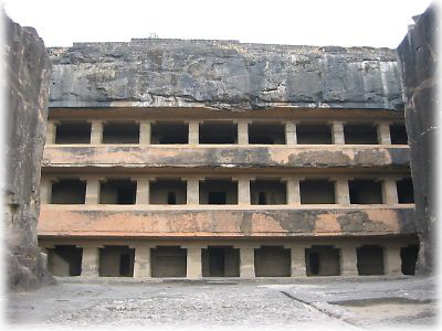 ![]() 石窟寺院は建設途中で放棄されたものも多い。こちらは3階建ての大規模なものながら、外側部分の装飾が未完成で、おばけアパートのよう |