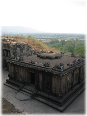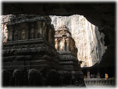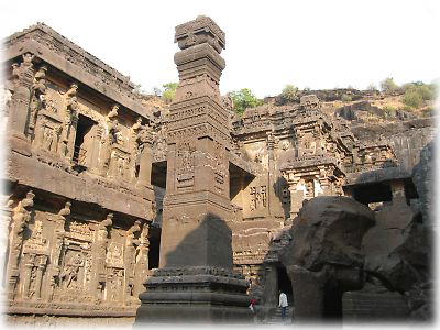 ![]() こちらがエローラ観光のハイライト、第16窟。これだけの規模の寺院を石の中からくり貫いたとは、インド人おそるべし。奥行き81×幅47×高さ33メートルの、まったく継ぎ目のない、世界でも類を見ない建築物だ |