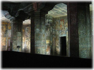 ![]() アジャンタの遺跡を有名にしたのは、そのすばらしい壁画だ。しかも紀元前1世紀のものと紀元5世紀のものという古代のものが残っているところもポイント。石窟寺院内部いっぱいに広がる壁画はインドの絵画が古代から発展していたということを証明している |