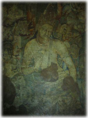 アジャンタ石窟群のハイライトのひとつ、第一窟。蓮華手菩薩の美しさには、ついつい目が引き込まれてしまう。この菩薩像が日本の法隆寺金堂内陣の装飾のオリジナル。文化のルーツをまざまざと見ている気がした |