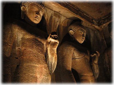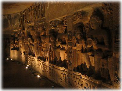 ![]() 第26窟の壁面に彫られた無数の仏像。ライティング効果もあって、幻想的な気分になる。どの仏像も手や体の一部が破損していて、それがまた時代を感じさせる |