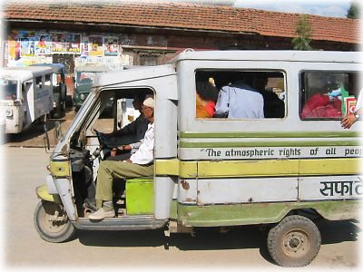 ![]() パタンからカトマンドゥまで戻る乗り合いティンプー。三輪車のくせに、人を10人以上も乗せてブイブイ走っちゃうんだからスゴイ |
