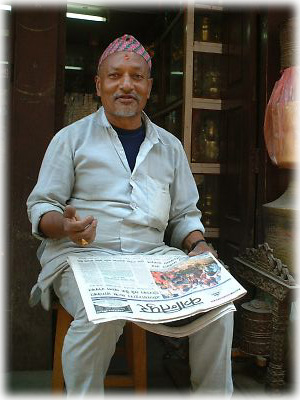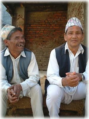 笑うおじさんと笑わないおじさん。ふたりそろって正統派ネパール衣装なのがよろし。おじさんたちがかぶっているのが男性の正装には欠かせない「トピー」という帽子 |