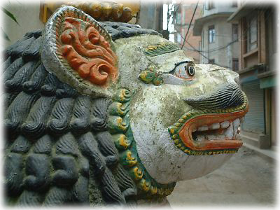 獅子にまたがる獅子のようなおばちゃん。ざっくり着たサリー、明日を見つめる目……ネパール人のおばちゃんはなかなか迫力あり |
