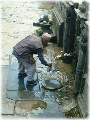 パタンのあちこちで今でも使われているダーラ(水汲み場)を見かけた。持ってきた水筒に水をくむおじさん |