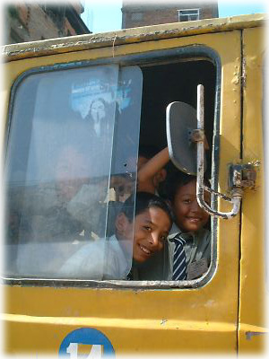 通学バスのなかから、「あっ、日本人だ〜」と興味津々な小学生。カメラを向けたらキャーキャーとうれしそうでした |