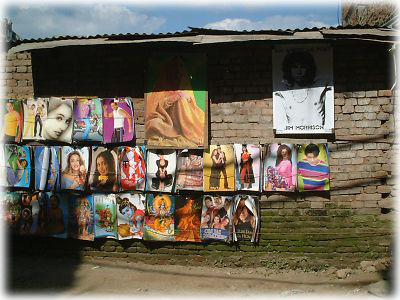 ![]() 燦々と照りつける太陽の下、ひときわ不思議な空気を出していた無人ポスター屋。神様やらヒンディー映画の女優に交じってジム・モリソン大健闘!(右上の乳首が見えてるヤツね) |
