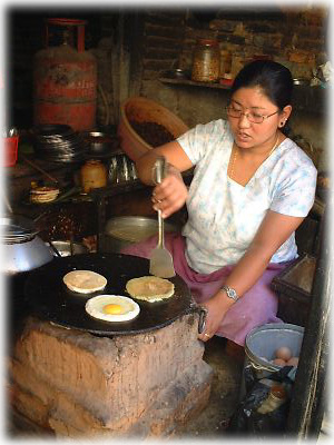 道ばたの名もなき飲み屋でお姉さんがウォー(ネパール式お好み焼き)を焼いていた。ポトンと落とした卵がなんともうまそう |