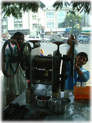 こちらはさとうきびジュース屋さん。最後の一滴までギューギューしぼってレモンをたらして飲む。衛生的には勇気のいるものですが、味はケッコウ美味 |