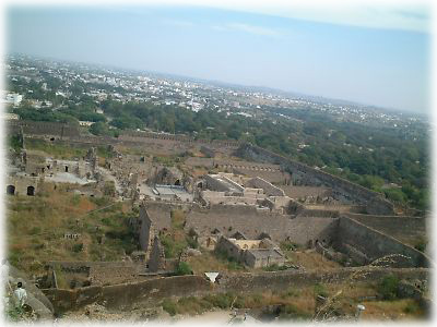 ![]() ハイダラバード観光のメインのひとつ、ゴールコンダ・フォート。巨石のうえに築かれた城とその城をぐるりと取り巻く城壁はとてつもなく巨大で圧倒される。1507年から1688年までこの地域を治めていたクトゥブ・シャーヒー朝の王様の城。ちなみにこのあたりはかつて世界有数のダイヤモンドの産地だったらしく、王朝はかなりのお金持ちだったとか |
