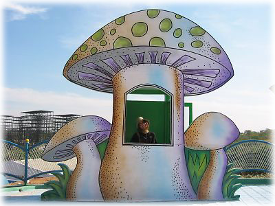 ![]() アミューズメント・スポットだけあって、あっちこっちにポップな建物が。きのこ型のボックス(中は何もなし)を見つけたので、とりあえず入ってみる |