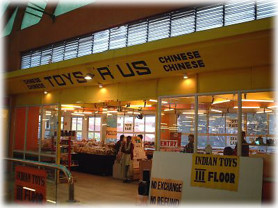 ![]() あ、トイザラス発見! でもよ〜く見るとロゴがちょっと、いやかなり違うような……。しかも「CHINESE」と書いてあるのはナゼ? 中に入って納得、中国製のおもちゃが多いのです |