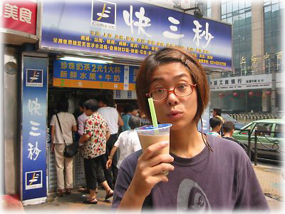 ![]() 上海ほか、中国各地で目にしたジュース屋「快三秒」。いいネーミングですね。ちなみに飲んでいるのは台湾で流行ってるといううたい文句のミルクティーに黒い色したでかいタピオカが入ったもの。ウマイ! |