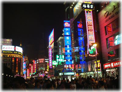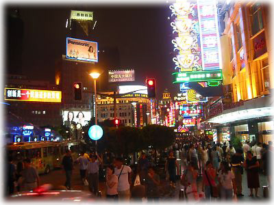 ![]() 夜の南京東路。ネオンの街、上海らしい光景でしょう。ここまできらびやかだとまるでお祭りみたい。行きかう人々の顔もなんとなく艶っぽく見えるから不思議 |
