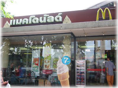 ![]() タイのマクドナルド。タイ語で書かれているのがなかなかエキゾチック。ちなみに料金的には日本よりちょっと安いぐらい、タイ感覚で行けばけっこうな高級料理 |