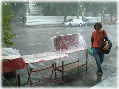 ![]() 雨季だったため、一日一回はこんな激しいどしゃぶりが。露天商はみなすばやくカバーをかけ、とっとと雨宿りに行く。中にはこんな感じで逃げ遅れる人も |