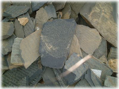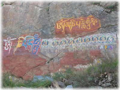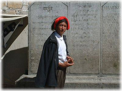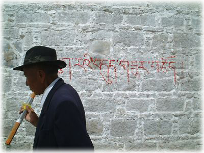 ![]() 何やら古代の暗号文字のようなチベット語の書かれた壁の前を、マニ車をまわしながら通りすぎるおじさん。この字を見ると妙にソソられるのは私だけ? |