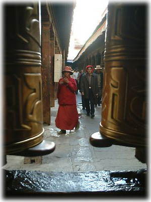 ジョカンのなかのマニ車から、参拝にきた人をパチリ。ジョカンはさすが中心地のお寺らしく、観光客よりも熱心にお参りしているチベット人のほうが断然多い。みな宗教上の理由で時計回りに参拝する |