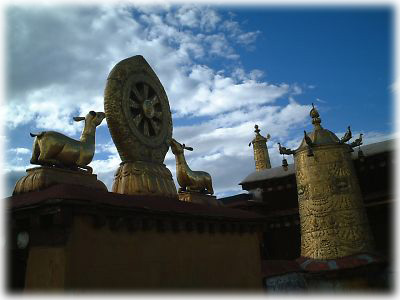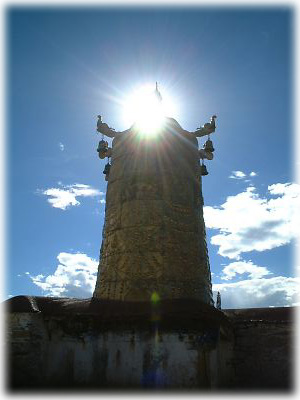チベットの青い空に光る太陽、黄金に輝く鐘。こんな光景を見ると「チベットにはやっぱり神様がいるのね」と素直に思ってしまう |