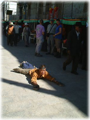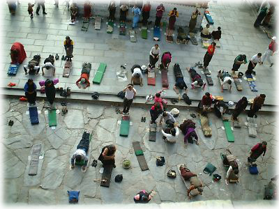 ![]() ジョカンに向かって五体投地する人々。五体投地とはまさに五体をささげ、地面に突っ伏して祈るチベット・スタイルのお祈りフォーム。人は一日中絶えることなく、みな熱心に祈ってます |
