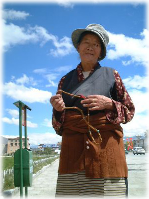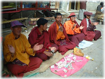 ![]() 道ばたでお経をあげ、お布施を受けるラマ(僧)。ラサではよくある光景だ。しかし残念ながらキチンとしたお寺にいるラマはこういうことが許されておらず、実際はほとんどがインチキ・ラマらしい |