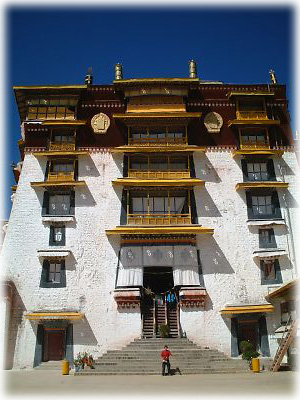![]() 抜けるような青い空のもと、世界遺産に指定されているポタラ宮の前で。主不在の城だが、威風堂々としたたたずまいからはそんな悲壮感はみじんも感じられない。天空の街の天空の城だ |