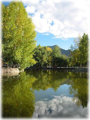 ポタラ宮の向かいの広場にて。さて、どっちが上でしょう? という具合に風景がキレイに湖に反射していた |