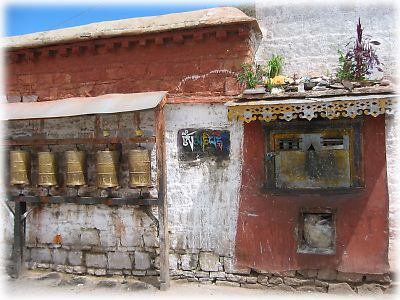 ![]() お寺のまわり、生活のいたるところに見られるマニ車。宗教と生活が自然と溶け合っているのが感じられる。赤と白のコントラストがまぶしい |