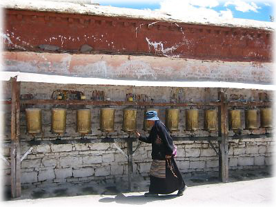 ![]() ポタラ宮のまわりのマニ車をまわすチベット人のおばちゃん。一回まわすことに中に入っているお経を一回まわしたことになるという実に便利なチベット仏教グッズ。おばちゃんは見かけによらず強い力でぐるぐるまわしていく |