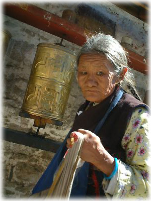 マニ車の前で張ってたら、おばあちゃんにギロリとにらまれた。チベット人のおばあちゃんはみんななんともいえぬ迫力がある |