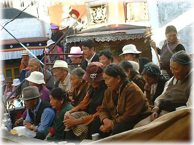 ![]() お祭りの様子を真剣に見詰めるチベット人のおじちゃん、おばちゃん。みなバター茶と椅子を持参してじっくり見入ってる……と思いきや、よく見ると居眠りしている輩もいるよう |