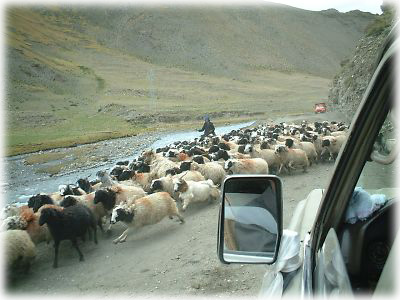 ![]() 後ろ髪を引かれる思いでラサを後にし、ネパールを目指す。途中ガイド氏が「渋滞だ」というから何かと思ったら羊さんの渋滞だった。慌てふためいて逃げる羊さんたちの姿は見てると一匹連れて帰りたくなるぐらいカワイイ |
