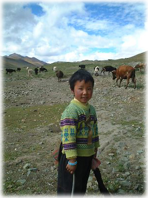ヤムドゥク湖のほとりにて、牛を追う少女。よくよく見ると手編みのセーター。チベット人のお母さんはみな子供に似合う編み物の名手だ |