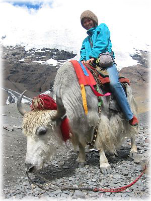 カルーラ山の麓で、早くも本日二匹目の観光用ヤクに乗る。「白いヤクと黒いヤクの違いを知るため」と言い訳したけど、別にたいした違いはなかった |
