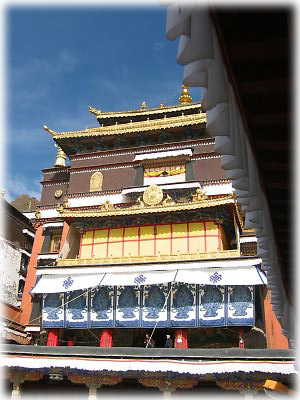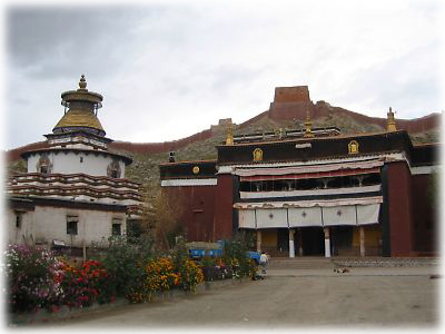 ![]() ギャンツェの名所のひとつ、パンコル・チューデとチベット最大の仏塔、8階建てのギャンツェ・クンブム。なかなか美しい外観。周囲に妙に犬が多いのが気になった |